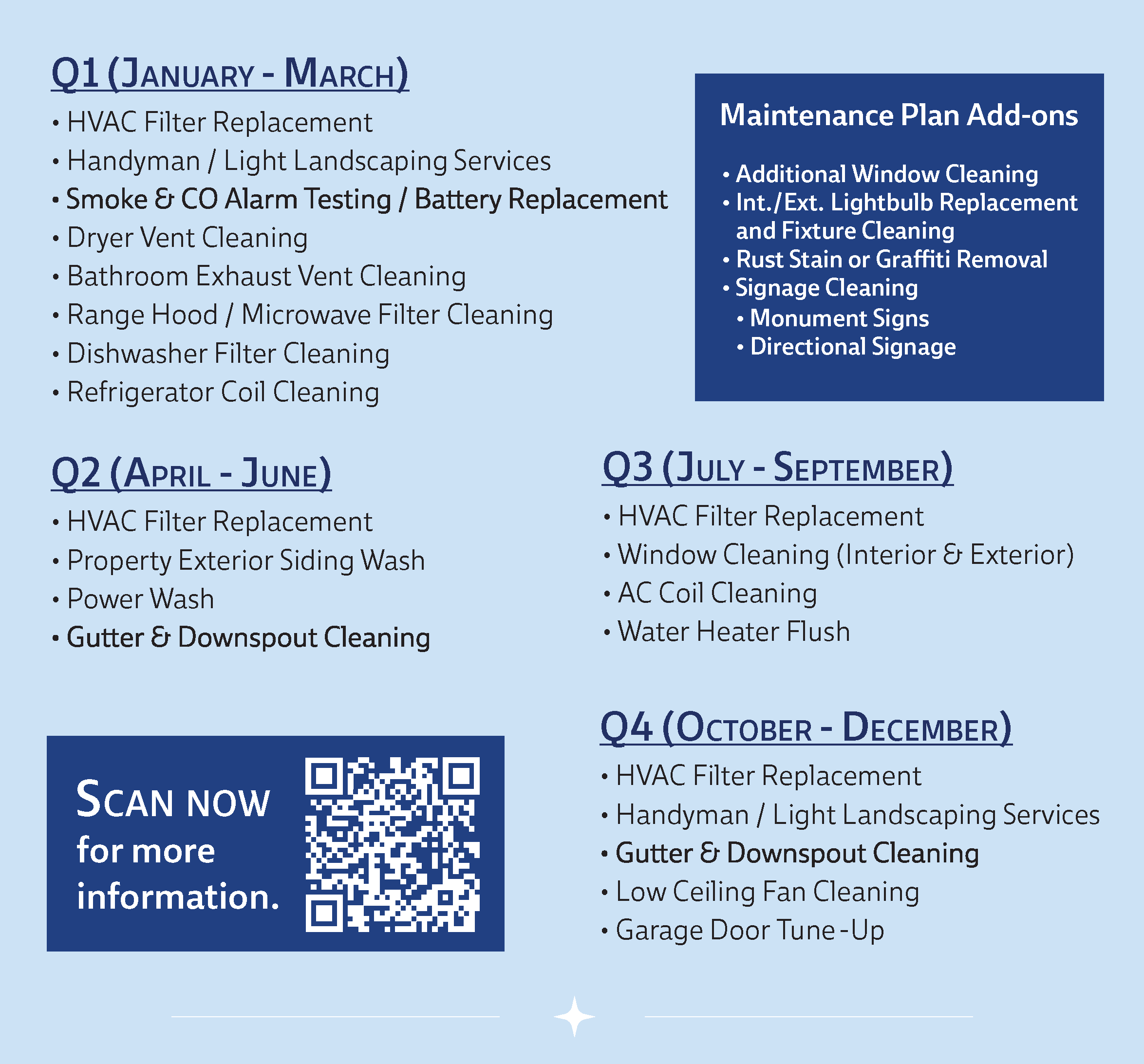 Our schedule of comprehensive visits cover essential services designed to safeguard health, safety, and appearance – every three months – with flexible options to customize and add services. Your will receive a “Property Health” report with before-and-after photos each visit.